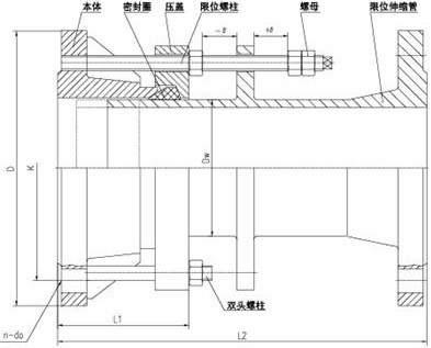单法兰松套限位伸缩接头特点:实现了管道一边法兰连接,一边为的不一致性的方便连接 VSSJA-1/BF VSSJA-